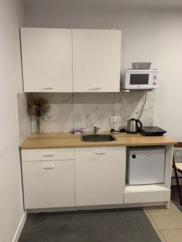 санузел - совмещённый, мебель - кухня, хранение одежды, спальные места, холодильник, плита, стиральная машина.