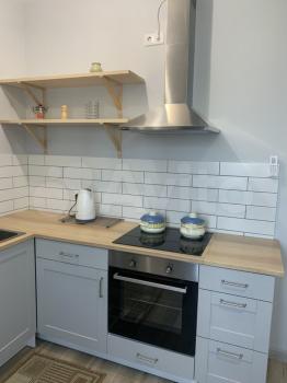 Кухня укомплектована необходимой бытовой техникой: кухонный гарнитур, холодильник, СВЧ, электроплита с духовым шкафом, вытяжка.