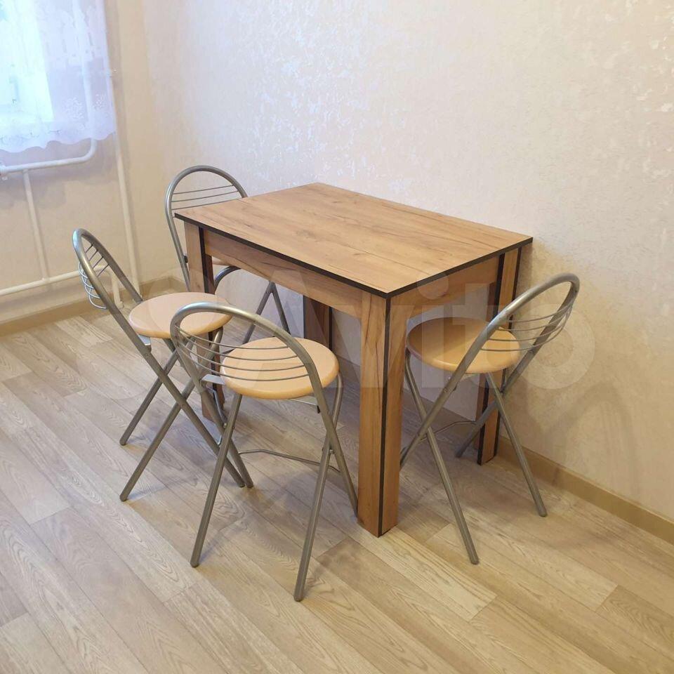 На кухне используется угловая компоновка мебели, в которой предусмотрены три удобные рабочие поверхности с подсветкой, плита с многофункциональной духовкой и таймером, вытяжка, холодильник (сейчас установлен НОВЫЙ холодильник, не тот, что на фото), чайник и микроволновая печь. Над раскладным обеденным столом расположено бра для приглушённого освещения.