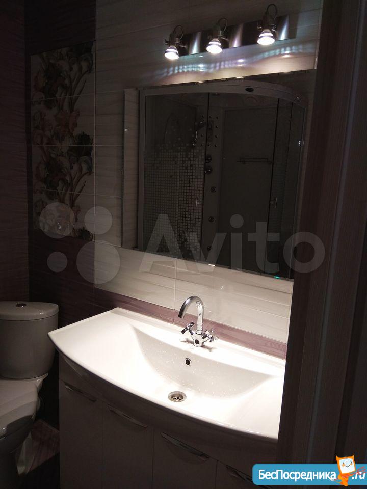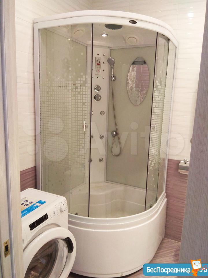 В совмещённом санузле находятся большая раковина с зеркалом и интерьерной подсветкой, современная душевая кабина с классическим и тропическим душем и радио, новая стиральная машина. За потайным люком расположен водонагреватель.