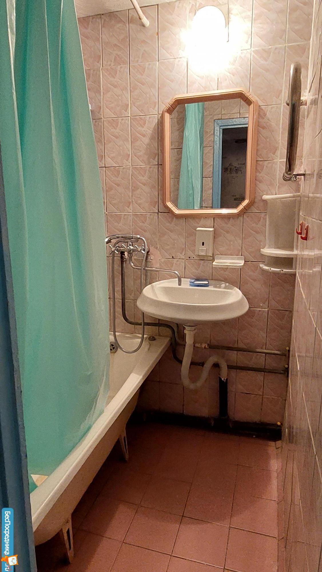 Ванная комната с новой плиткой и обновлённой сантехникой. Во всей квартире выполнен косметический ремонт: светлые однотонные стены, мебели немного (при необходимости часть можно убрать, допускается своя мебель).
