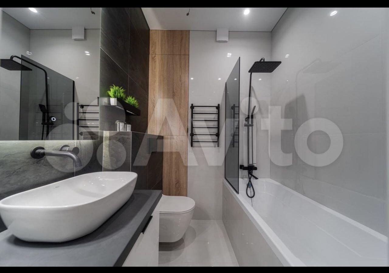 Санузел совмещенный. В ванной комнате подключена стиральная машина, тропический душ, унитаз-инсталляция, зеркало с подсветкой.