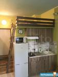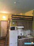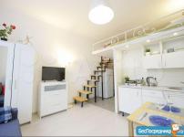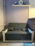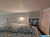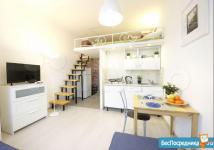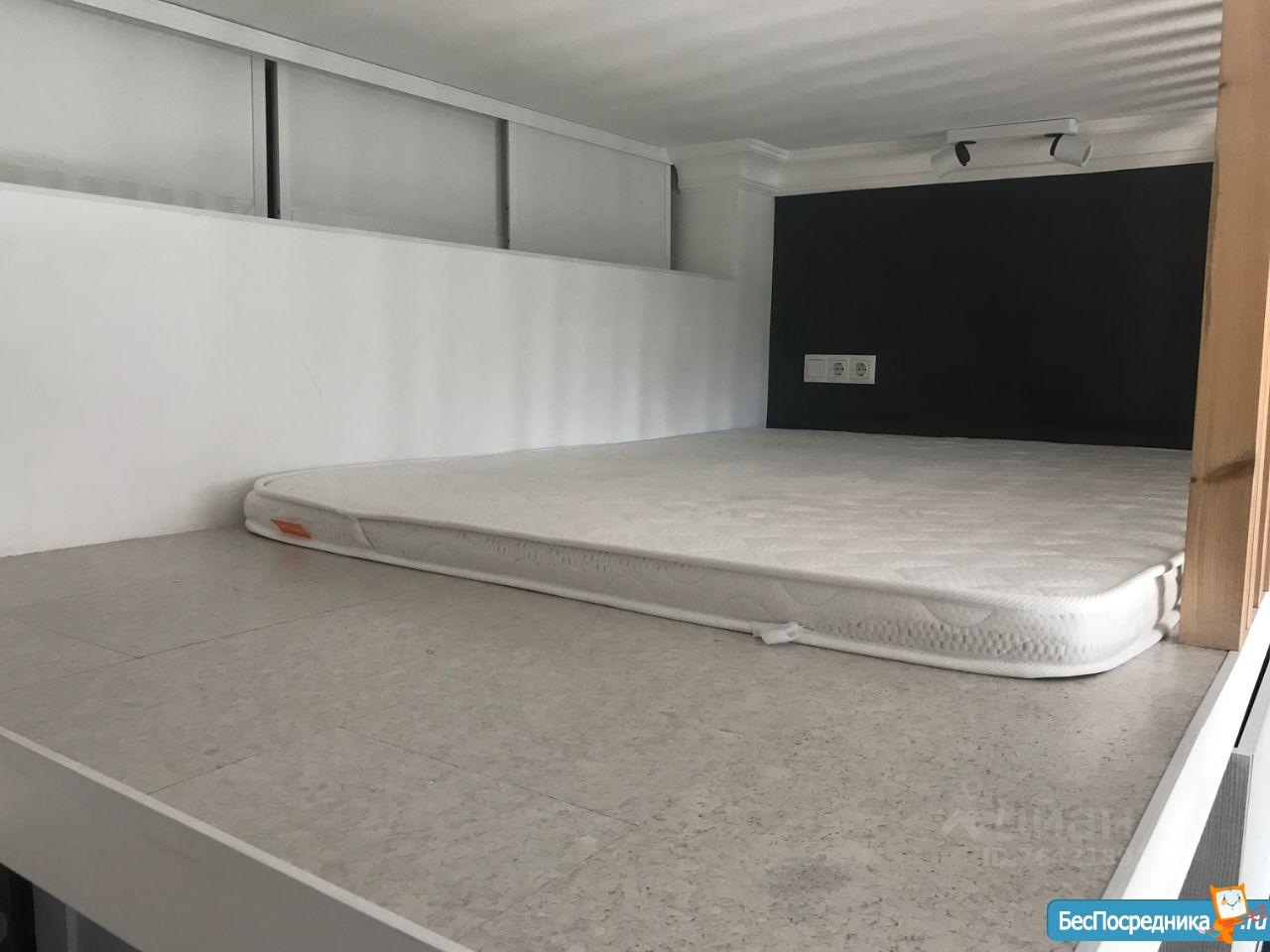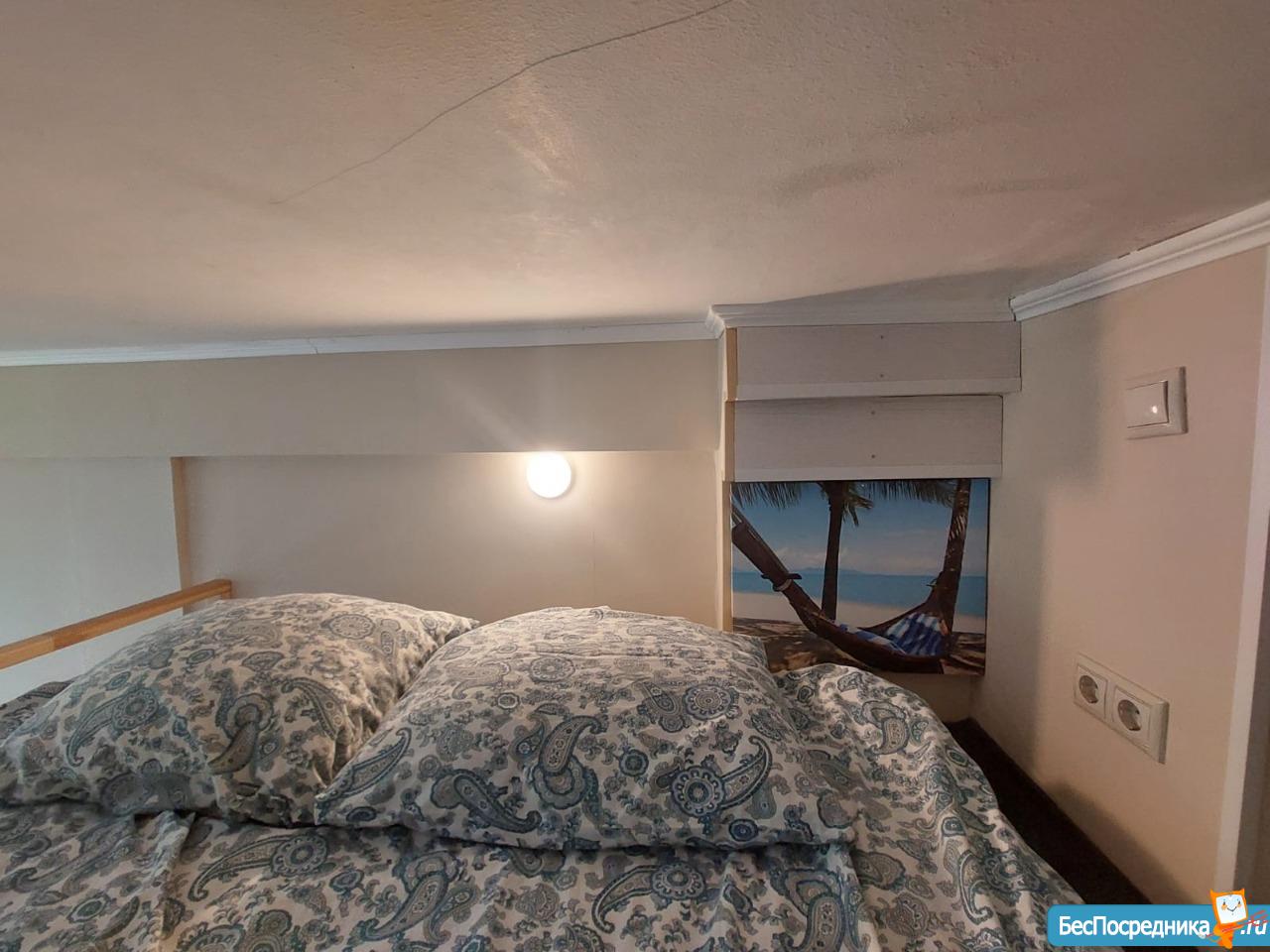 Студия оборудована полноценным спальным местом с ортопедическим матрасом Аскона 140х200 см на втором этаже (антресоли) и дополнительным спальным местом в виде раскладного дивана.