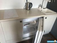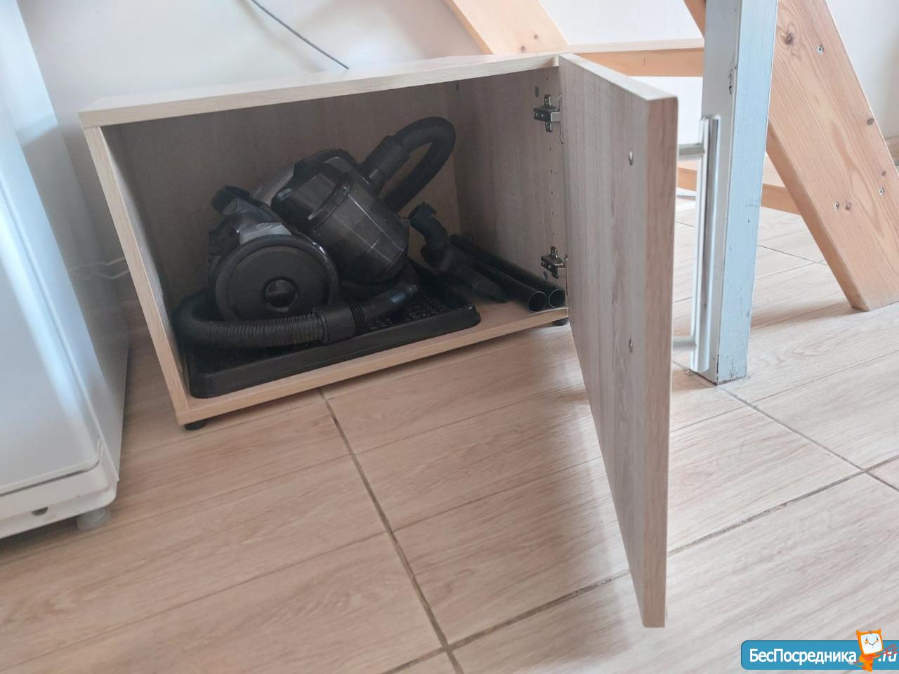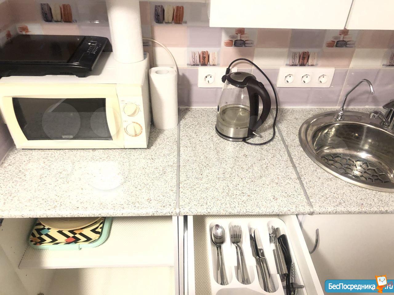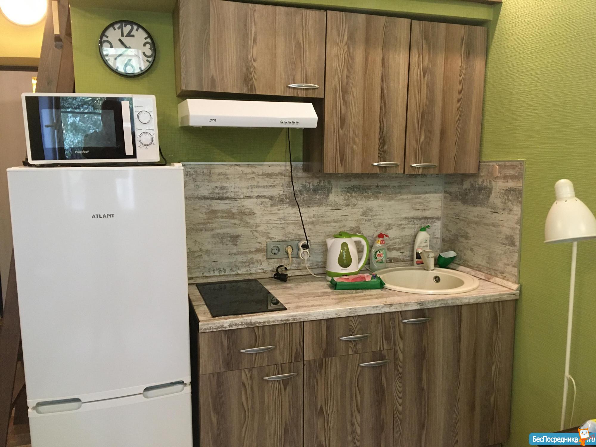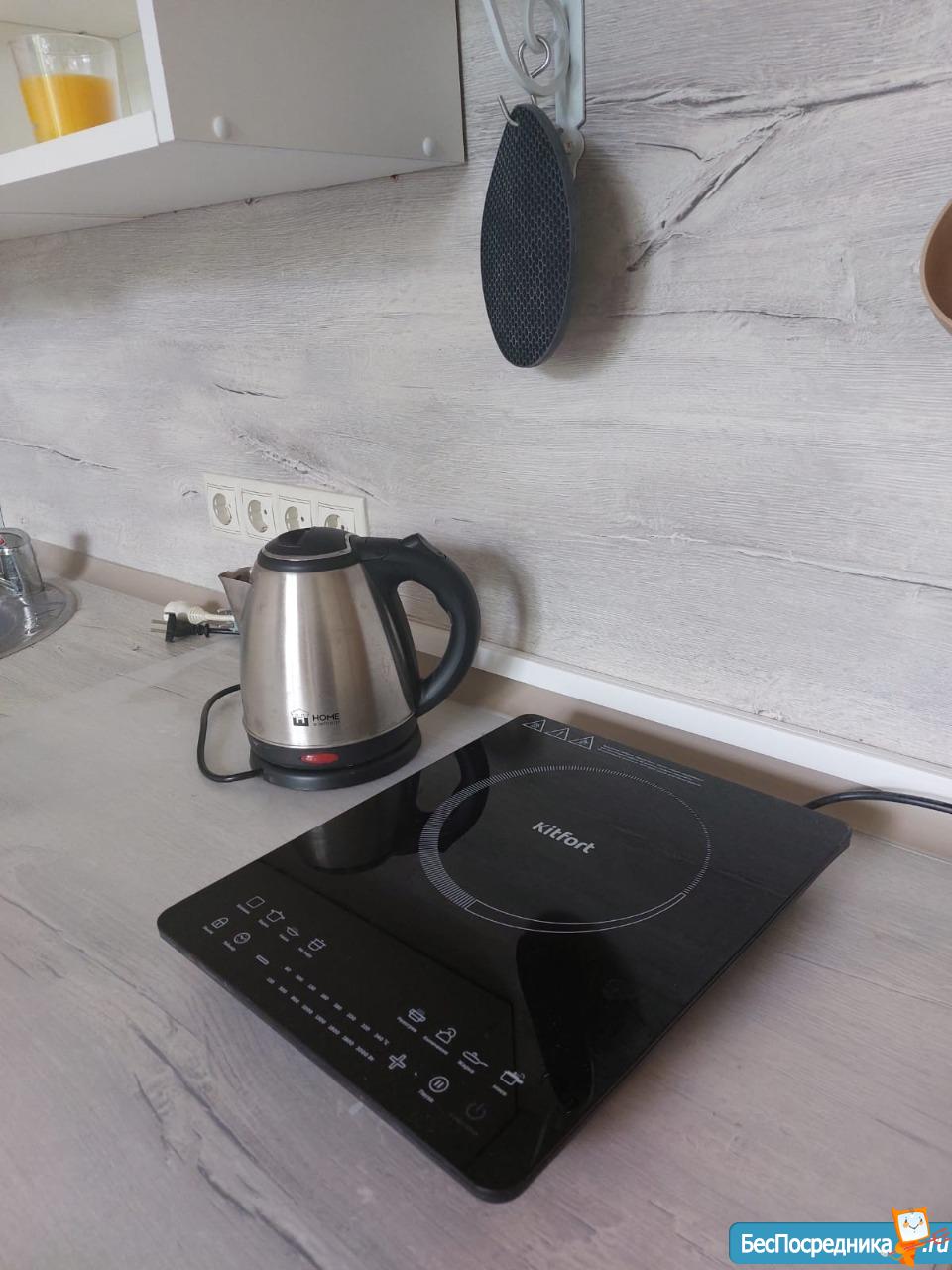 На кухне имеется встроенный холодильник с морозилкой, индукционная варочная панель. Установлен фильтр 4-хступенчатой очистки воды. Имеется вся необходимая для готовки и сервировки посуда.