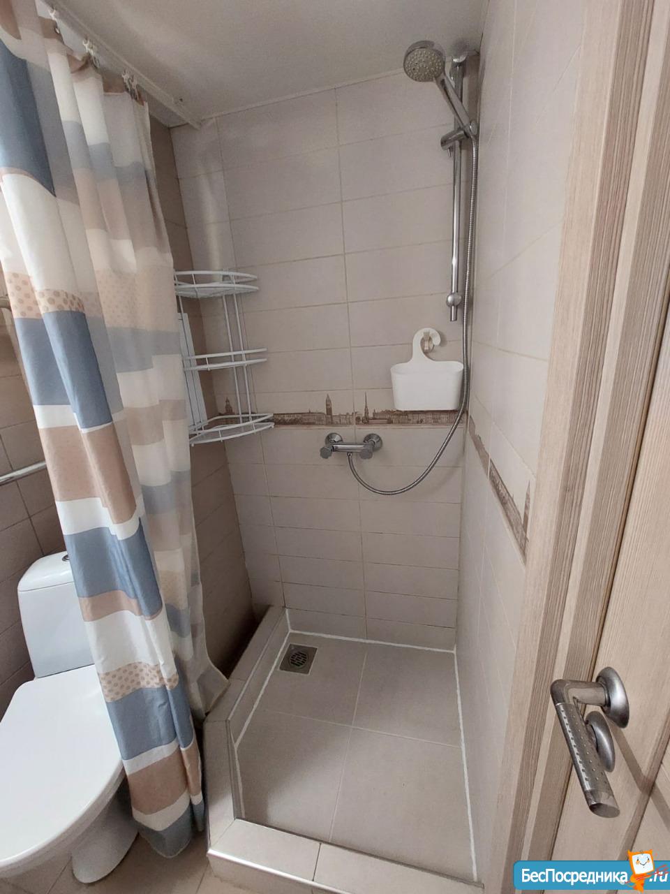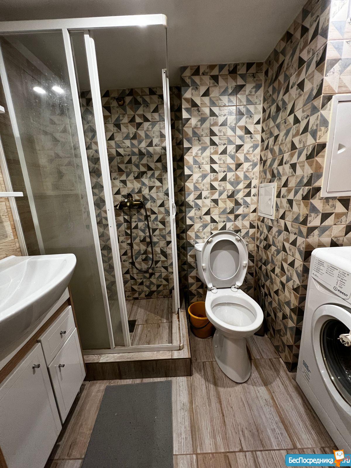 Качественная сантехника (Германия), душевая стойка с функцией тропический душ, бесшумная стиральная машина на 4 кг.