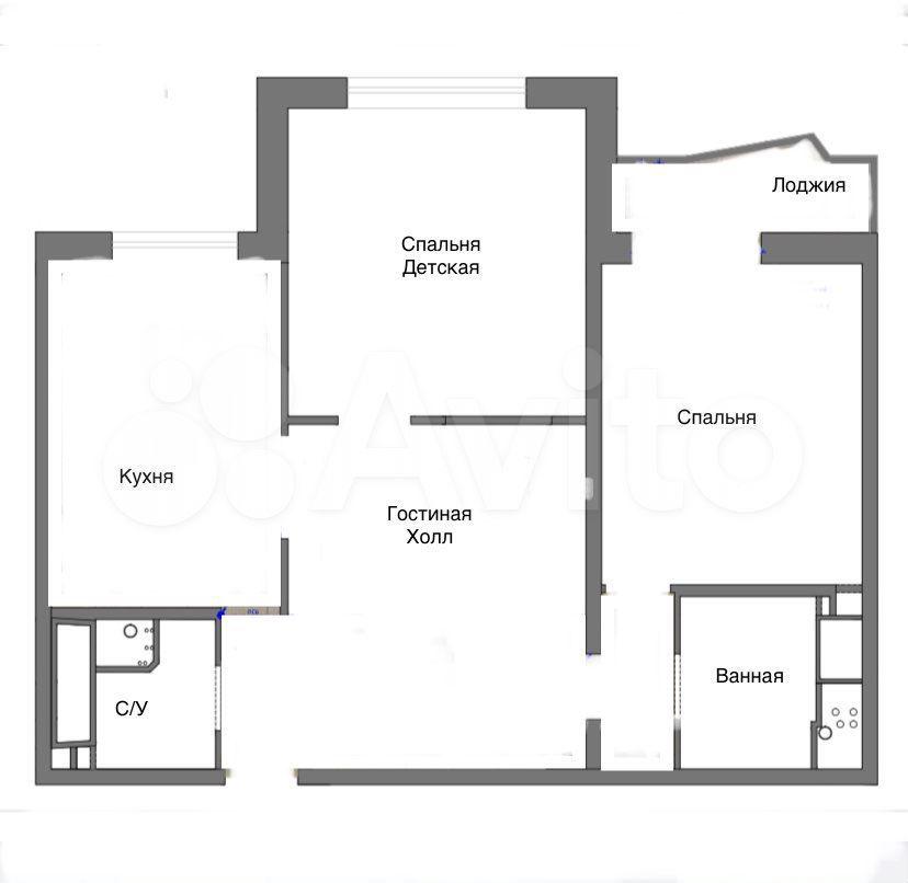 Две изолированные спальни с дверьми (одна комната, в центре квартиры, сейчас адаптирована под детскую, вместо двуспальной кровати стоит двухъярусная детская кровать). Проходная (не изолированная) холл-гостиная с диваном, большая кухня 14м2, два совмещенных санузла: один санузел с ванной, второй - с душем.