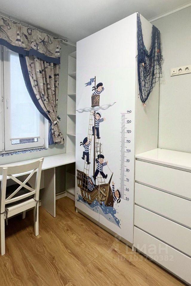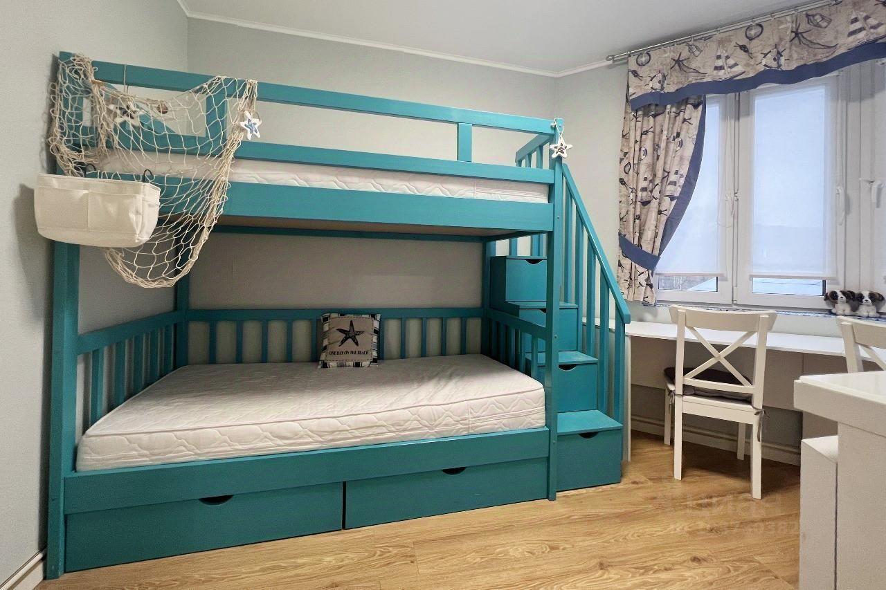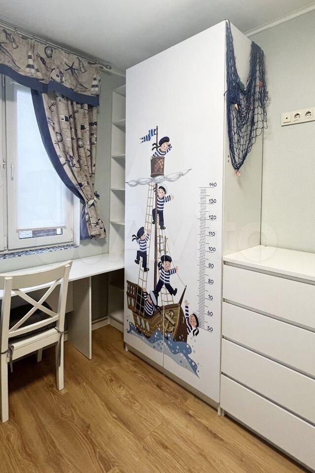 В комнате мальчиков двухъярусная кровать, рабочая зона, шкаф для одежды, тумба и место под ТВ на стене напротив кровати. Почти вся мебель на заказ, встроенная, что экономит место и позволяет функционально использовать площадь квартиры.