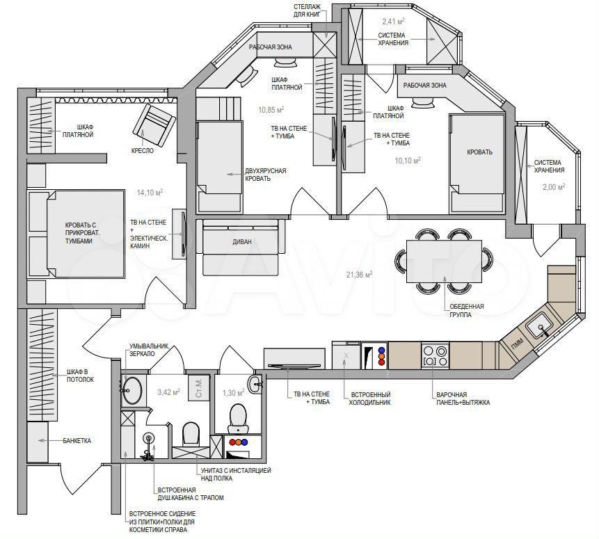 Благодаря грамотному дизайн-проекту имеется 3 изолированные комнаты (родительская спальня и 2 детские) и просторная кухня-гостиная 21м2. Коридора практически нет, при этом есть изолированная большая зона хранения обуви и верхней одежды перед входом в квартиру. Все продумывали до мелочей.