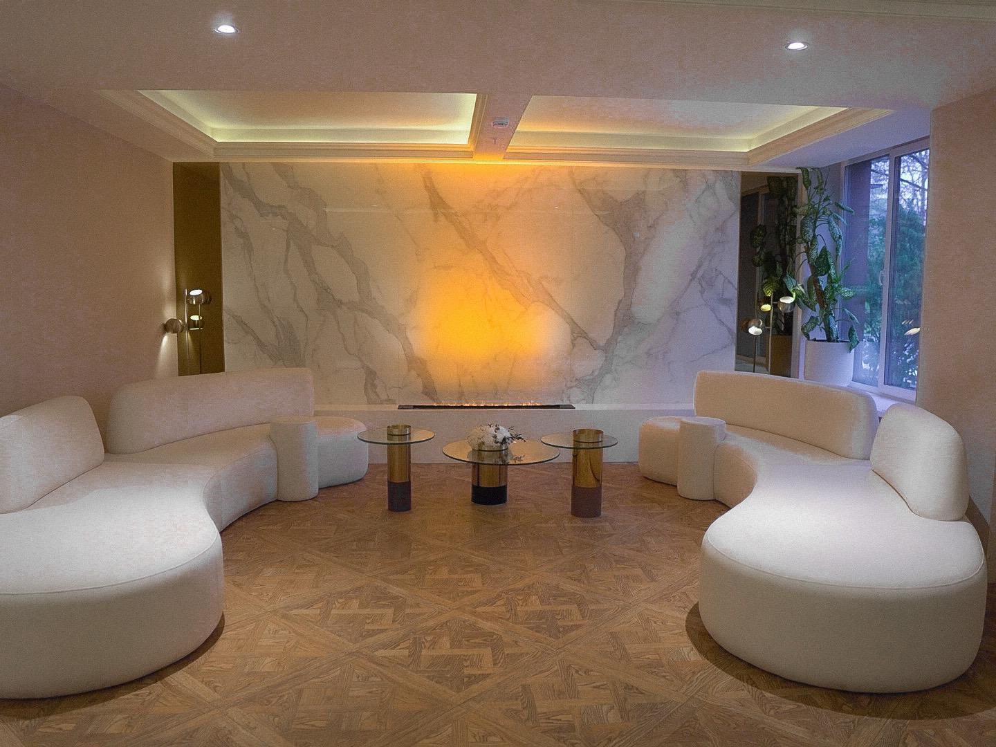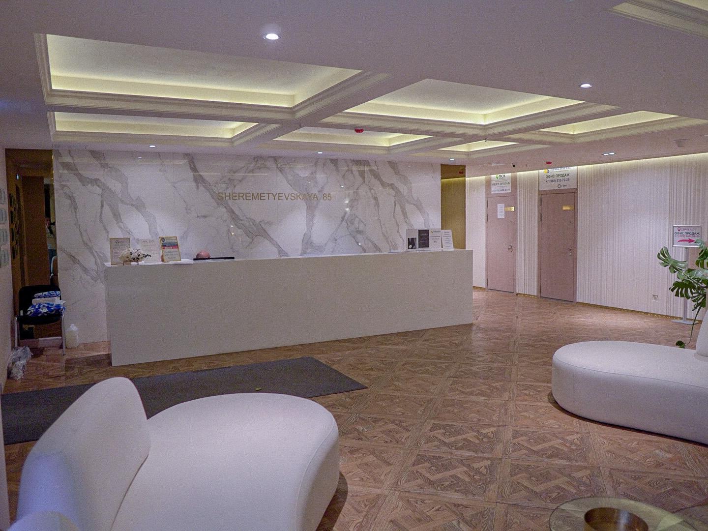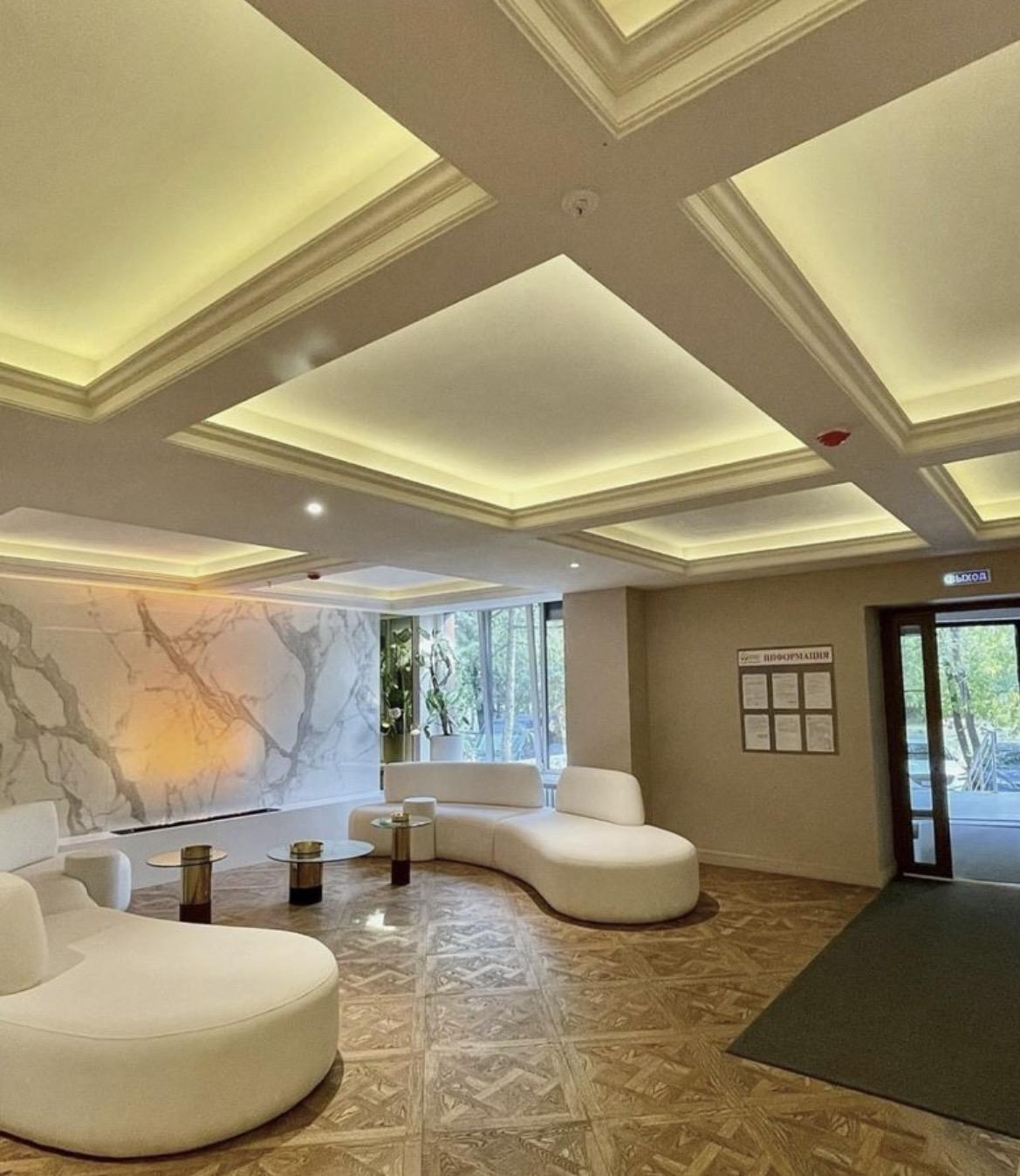 ? В ЖК сделан дизайнерский ремонт, холл с камином и диванами для комфортного ожидания.