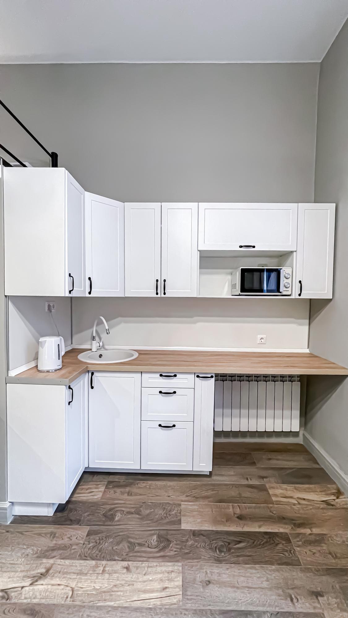 На первом уровне располагается кухня-гостиная, где есть все необходимое: холодильник, варочная панель, микроволновая печь, чайник,набор посуды, стиральная машина. Также здесь расположена зона отдыха с мягким раскладным диваном, стол с тумбой в стиле лофт и телевизором.