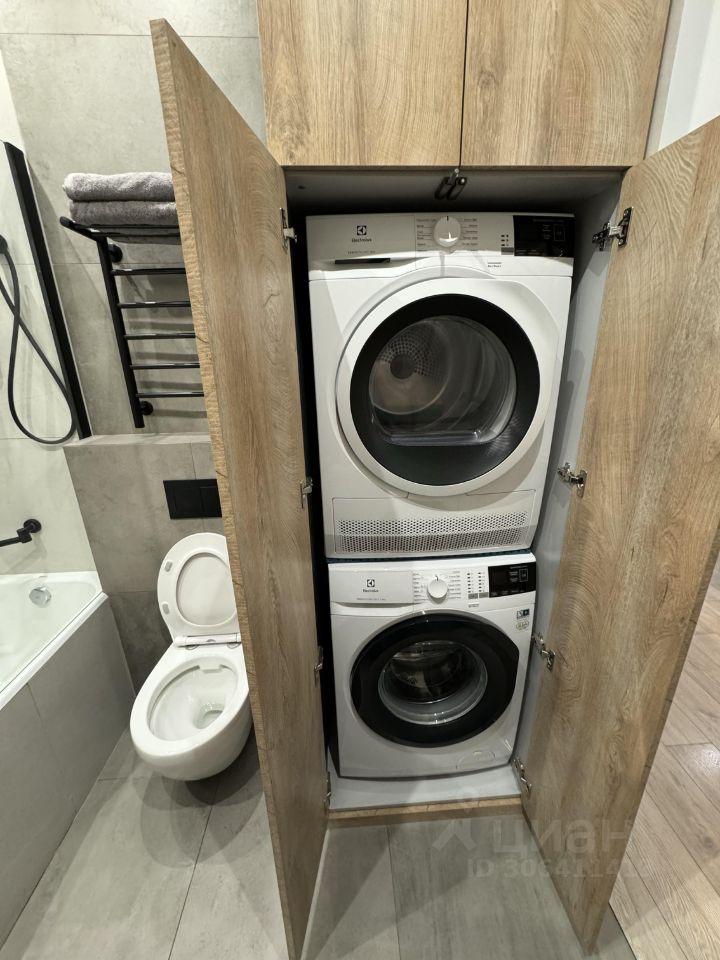 Квартира выполнена в дизайнерском стиле. В просторных кухне и комнате есть вся необходимая мебель, а также современная бытовая техника: холодильник, посудомоечная машина, телевизор (4К) и кондиционер. В совмещённом санузле установлена ванна, есть стиральная и сушильная машины. В квартире есть два балкона.