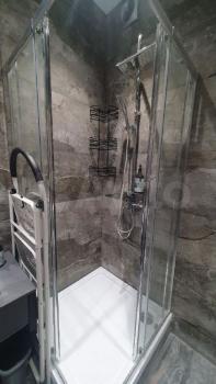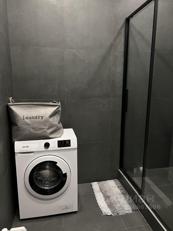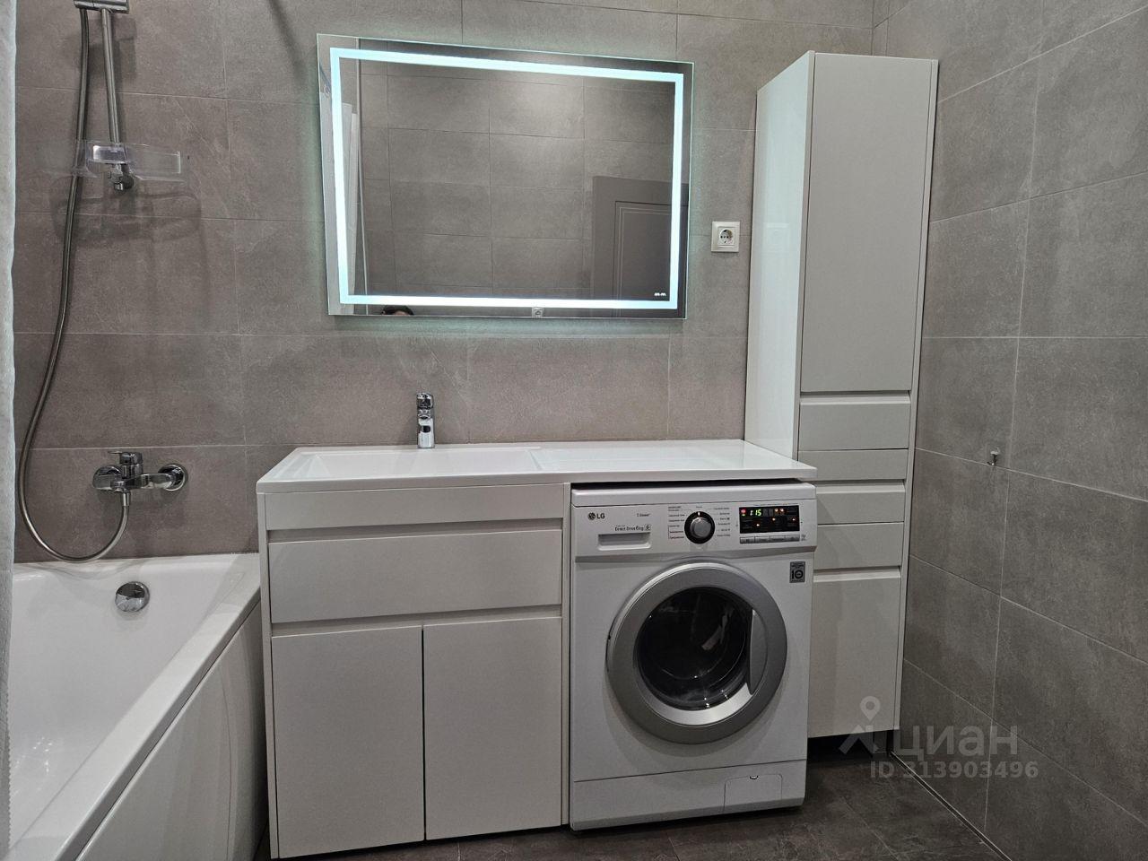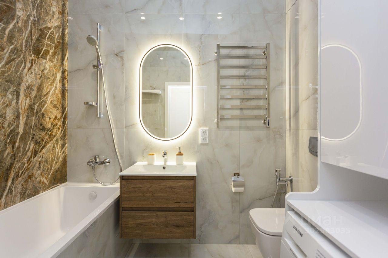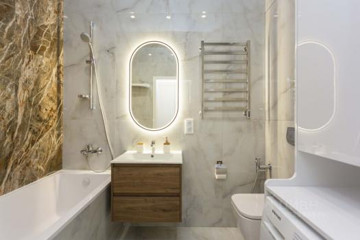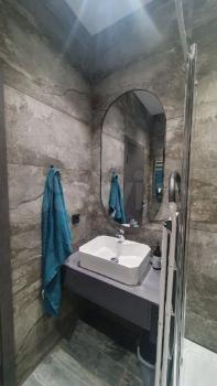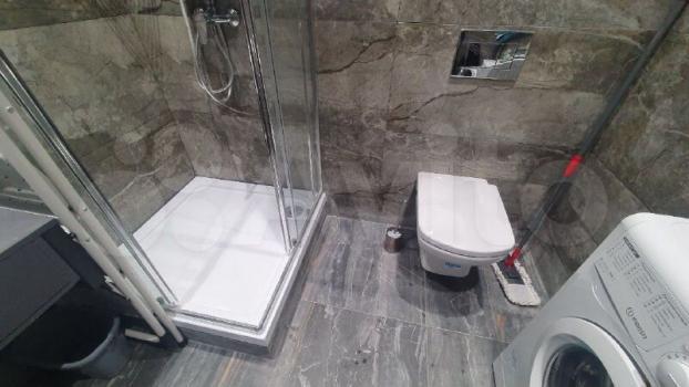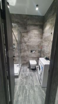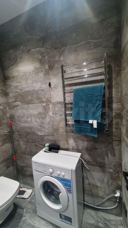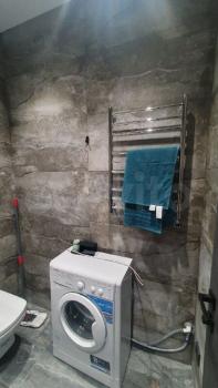 В санузле установлена стиральная и сушильная машины, проточный водонагреватель, электрический полотенцесушитель, теплые полы.
