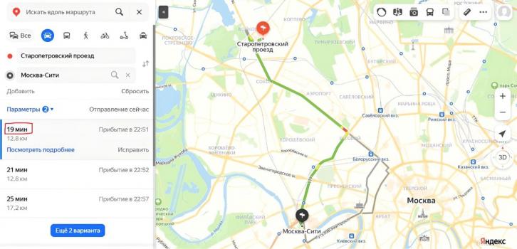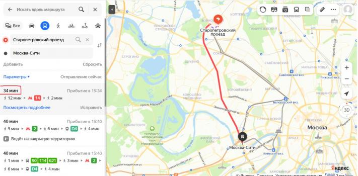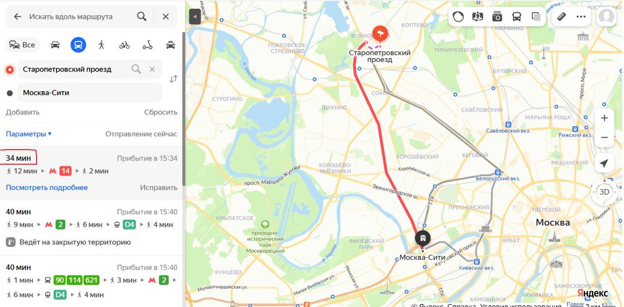 до Москва-Сити - 35 мин. с использованием общественного транспорта и 20 мин. на автомобиле,