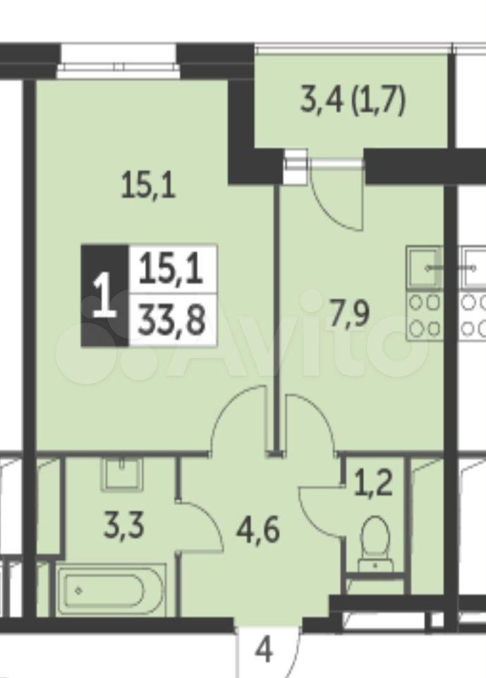 Площадь 33.8 кв.метров. Этаж 6.
