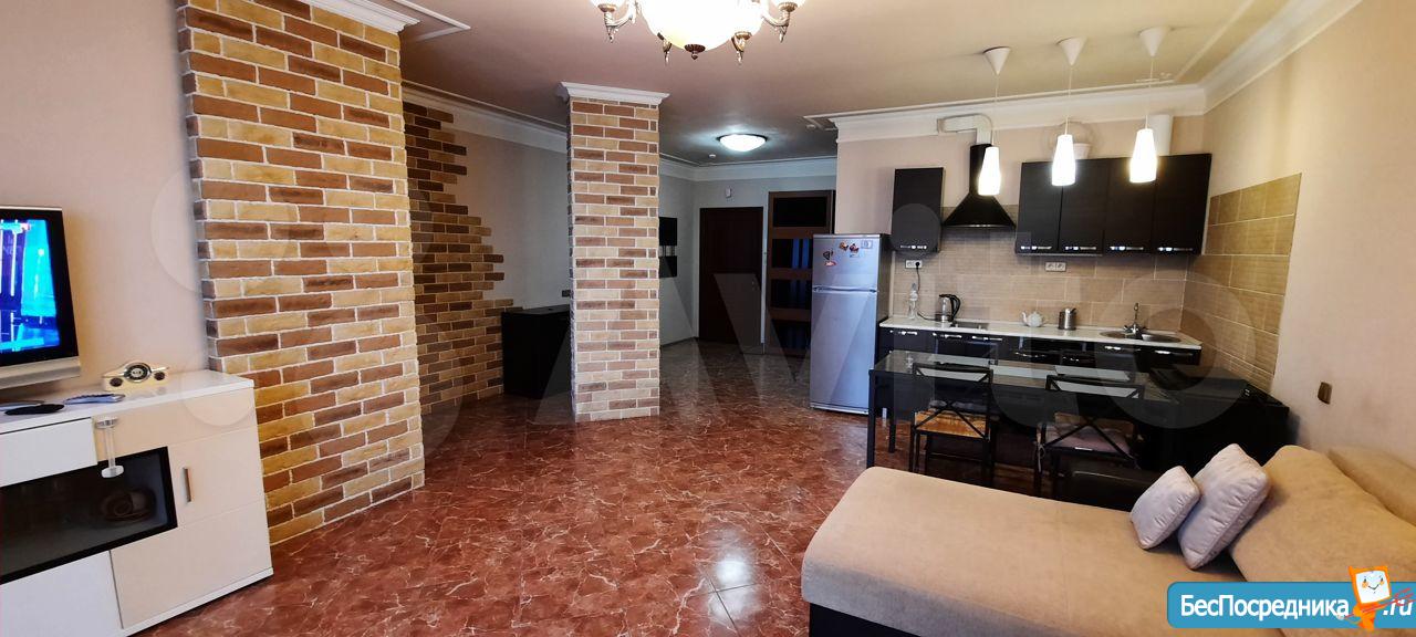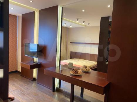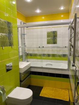 В квартире выполнен качественный евро ремонт. Просторная комната оборудована двуспальной кроватью и вместительными шкафами. На кухне установлена современная мебель и имеется холодильник. Ванная комната совмещённая, оснащена ванной и стиральной машиной.