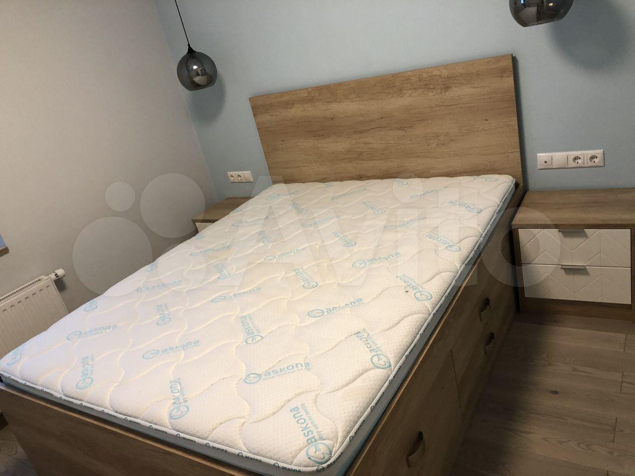 В спальне стоит кровать с мягкой спинкой и бортиками размерами 2*2 метра и ортопедическим матрасом переменной жёсткости. С двух сторон имеются шкаф и тумбочка.