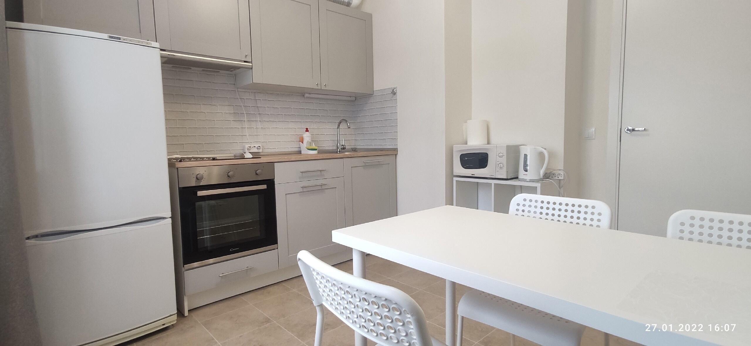 На неделе будет кухня. Есть микроволновая печь, новый холодильник, посуда, чайник, сушилка, утюг, стиральная машина, комод для обуви, рабочий стол для компьютера. Два больших матраса.