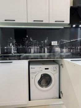 Есть оборудованная гардеробная, уютный балкон с панорамным остеклением (окна выходят на восток - виден лес, а не окна соседа) стиральная машина, микроволновая печь, холодильник, варочная панель, подсветка рабочей зоны на кухне, вытяжка, шторы блэкаут, сканди диван.