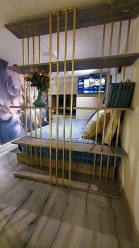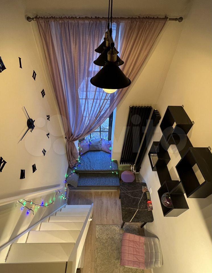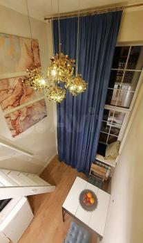 Площадь апартамента - 15 метров. 10 метров - 1 этаж, 5 метров - 2 этаж. Высота потолков - 5 метров.