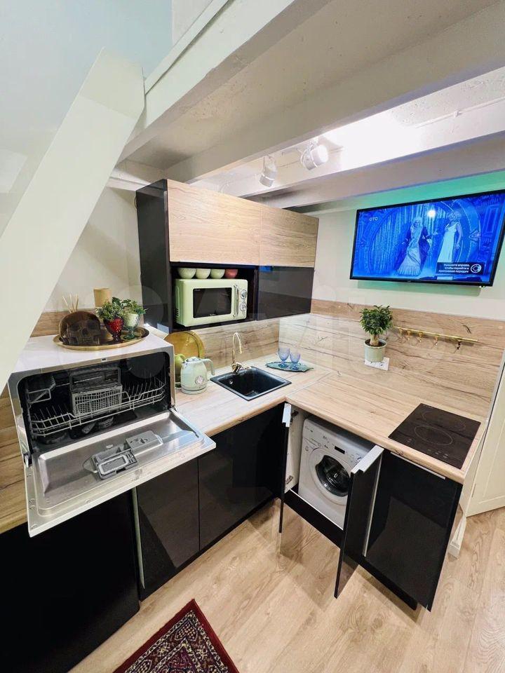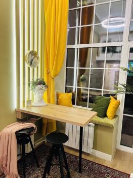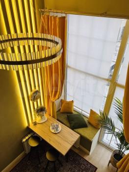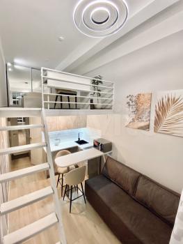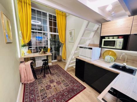 Уютно обустроенная просторная двухуровневая студия с дизайнерским интерьером в актуальном стиле, абсолютно новой техникой (на гарантии) и мебелью. Второй этаж полноценный, т.к. потолки 4 метра. Площадь первого этажа 18 метров, втрого - 13м. Эргономика продумана до мелочей: