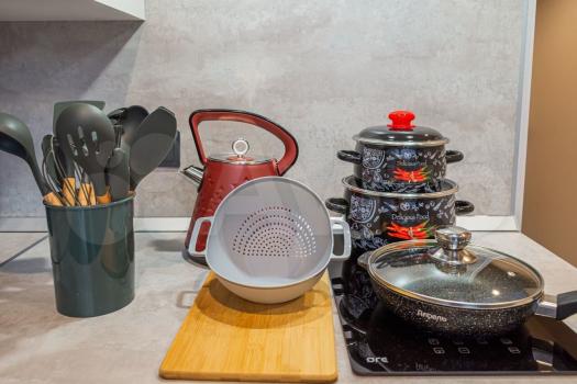 Кухонная зона : плита, микроволновка, чайник, холодильник, посуда для приготовления и приема пищи, бокалы, столовые приборы, штопор.