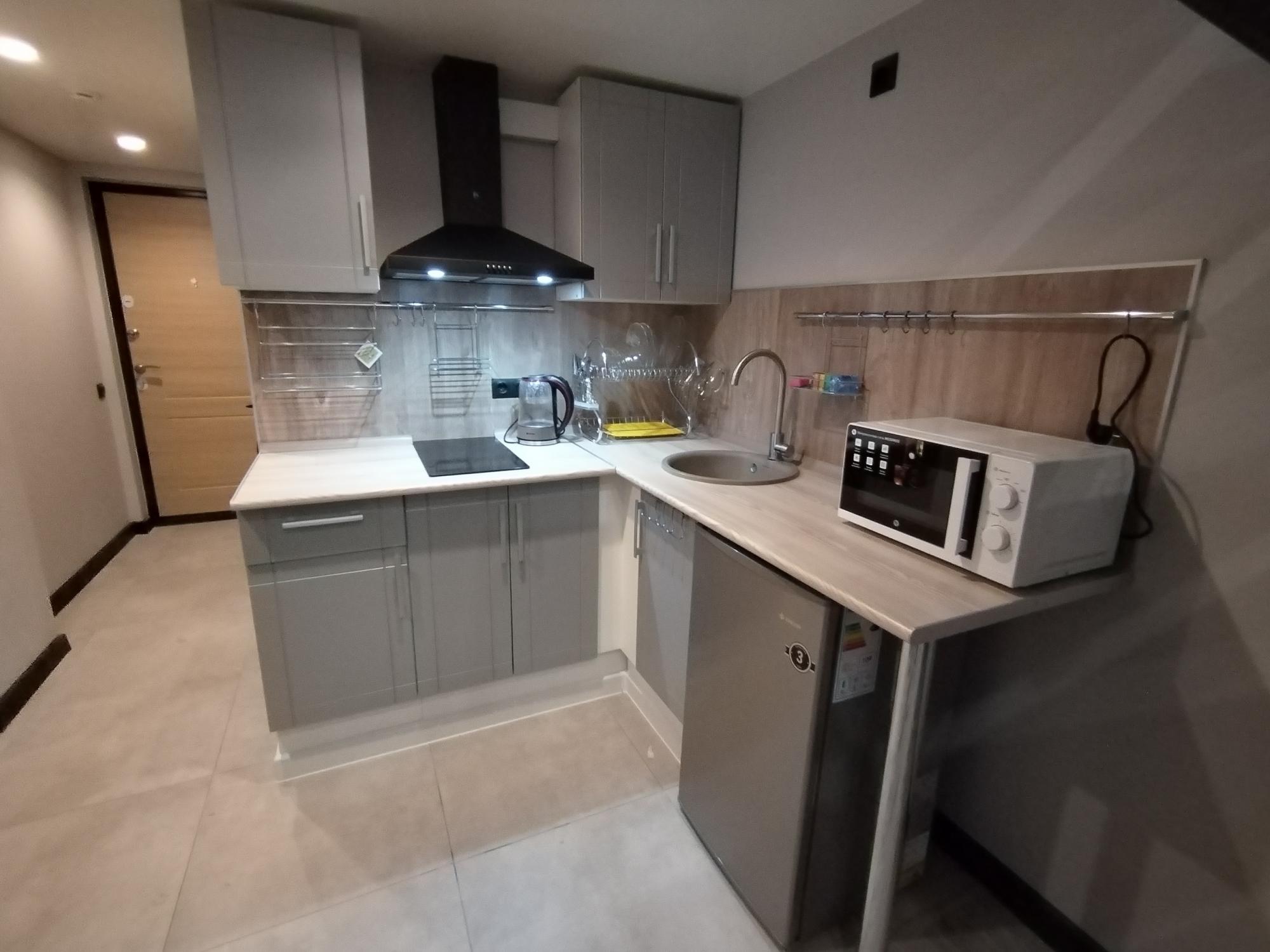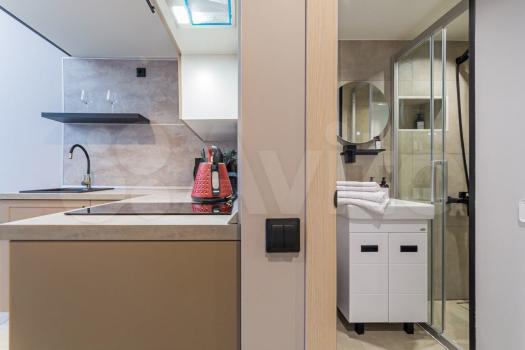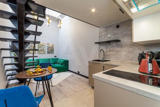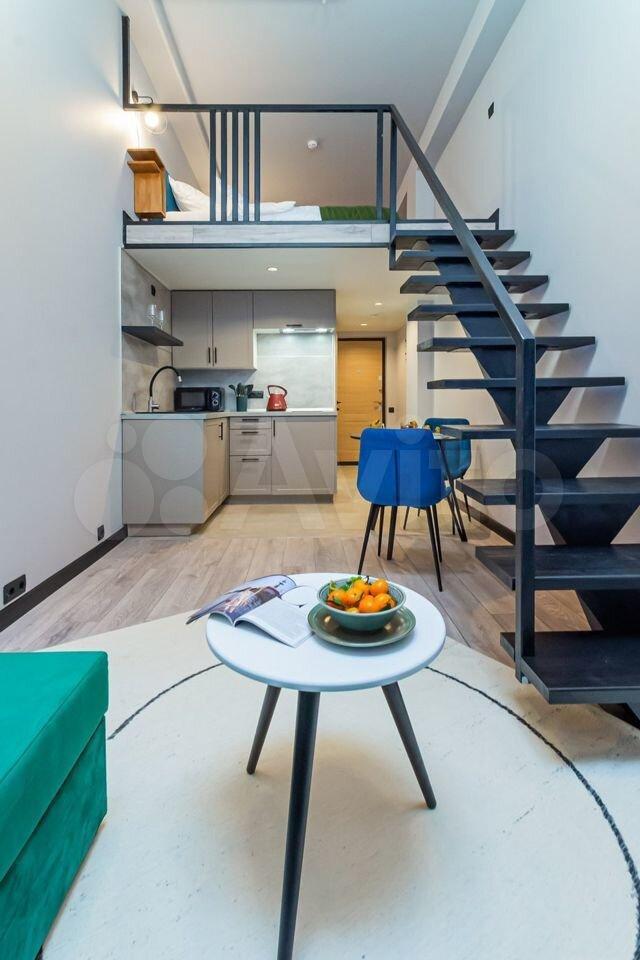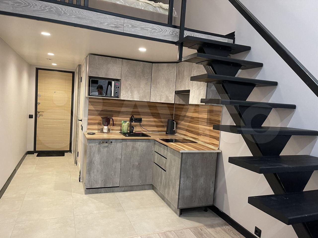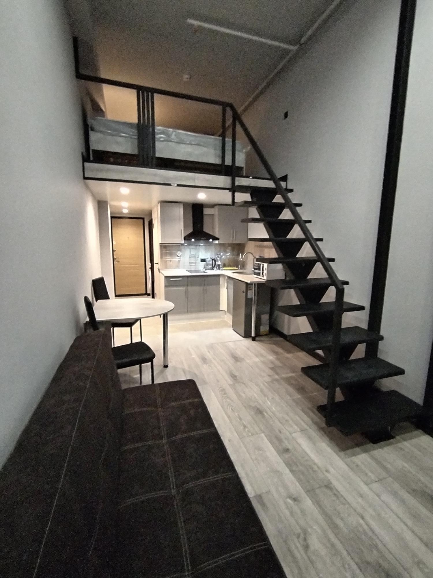 Студия с полноценным антресольным этажом. Красивая кухня с барной зоной, комфортная ванная комната с тёплым полом. Холодильник, микроволновка, посудомойка, стиральная машинка, варочная плита, вытяжка в комплекте.
