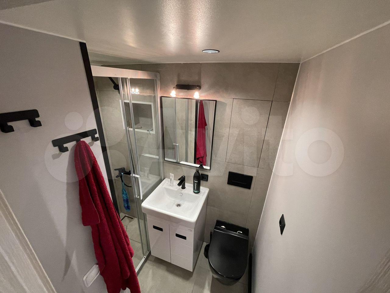 Ванная комната совмещенная, оборудована современной сантехникой и стильным освещением. В прихожей предусмотрены удобные полки для хранения вещей.