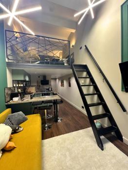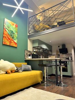 Апартамент занимает 14-ый этаж, предлагая самые высокие потолки в ЖК, достигающие более 2 метров на антресоли (общая 5 метров), что создает удивительное ощущение простора и комфорта. Из окон апартамента открывается захватывающий и живописный панорамный вид на город. Выполнен изайнерский ремонт. На первом этаже расположены прихожая, санузел с душевой кабиной и кухня-гостиная, в то время как на втором этаже находятся уютная спальня и гардеробная.