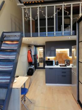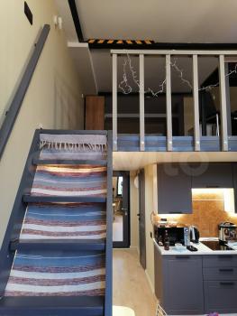 Очень уютная и тихая студия. Много свободного места. Высота потолков на первом этаже 2 и 3,6 метров, на втором 1,6 метра.