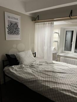 Высокий 4х метровый потолок и панорамное окно делает квартиру светлой. Окно выходит во двор, что обеспечивает тишину в доме. В высоту всего окна шторы блэкаут.