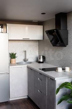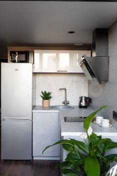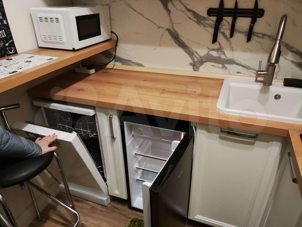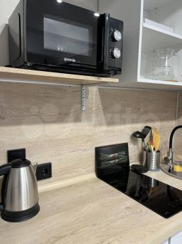 Удобная зона кухни с большим холодильником и полноценной морозильной камерой (no frost), посудомойкой, варочной поверхностью, вытяжкой, микроволновкой и чайником. Водопроводный кран предусматривает установку очистительной системы воды.