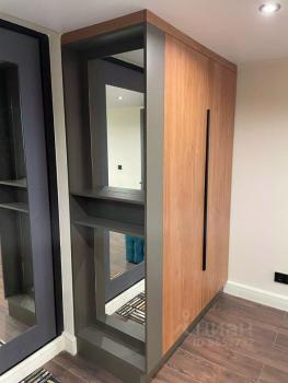 В коридоре находится вместительный шкаф для верхней одежды, обувница и банкетка.
