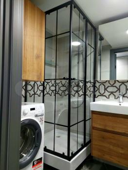 - Так же на первом этаже размещен санузел с выстроенной большой душевой кабиной (увеличенной и со стеклянными шторками по сравнению с другими подобными лотами), стиральная машина, бытовой шкаф, навесные полки.