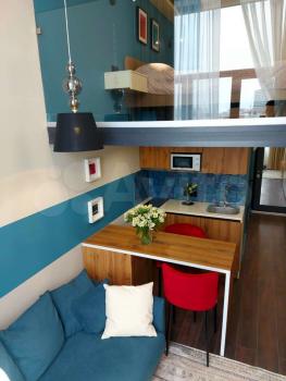 Предлагаю вашему вниманию двухэтажную (двухуровневую) современную видовую студию с новым ремонтом, новой мебелью и техникой. Диван-кровать аккордеон 2 на 1,4 м. Большое спальное место на втором этаже 2 на 1,8 м!!! Стиральная машина, пылесос, холодильник, плитка, мультиварка, чайник, шкафы и складные стол и стулья, рабочее место. Всё для счастливой жизни!