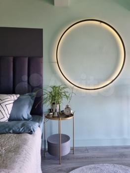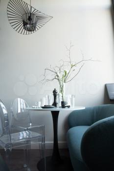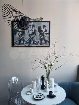 - В зоне гостиной расположен дизайнерский стильный диван, круглый стол под эффектной люстрой, 2 стула и стеллаж для книг.