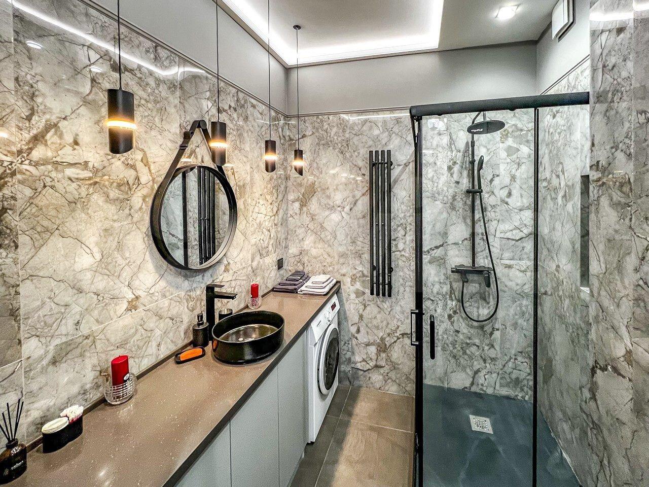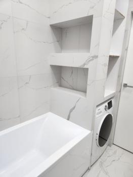 Ванная комната просторная, с вытяжкой и новой стиральной машиной.