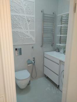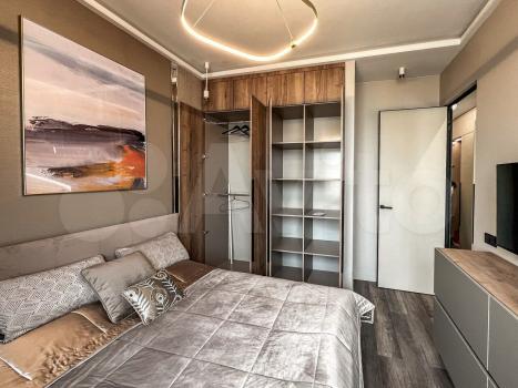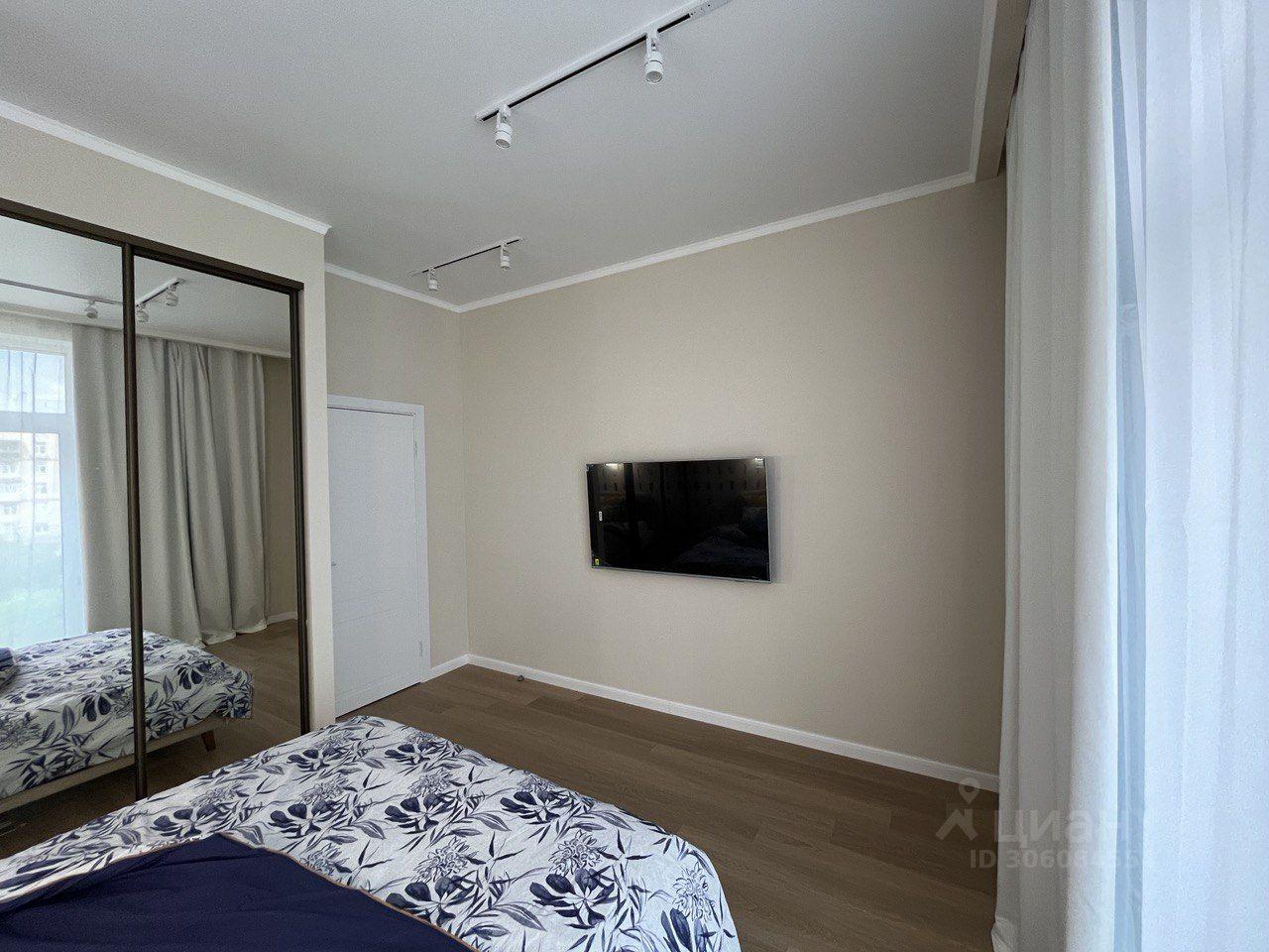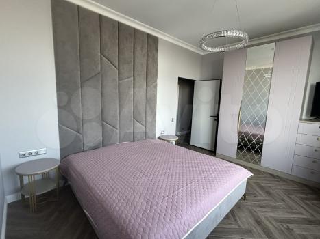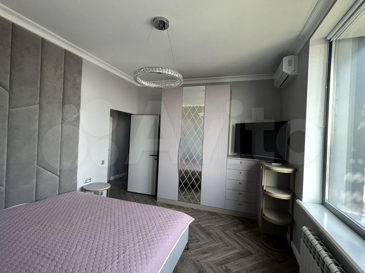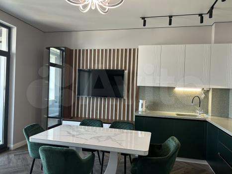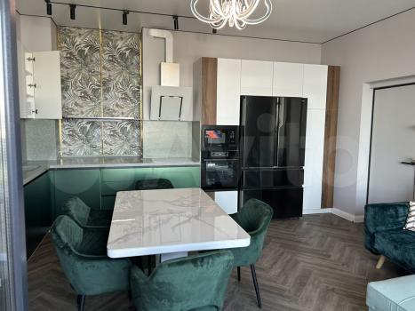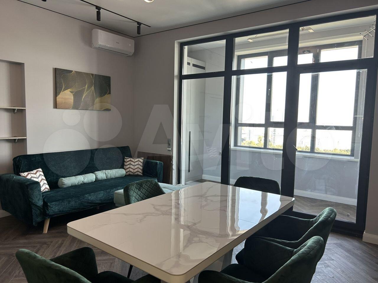 60 метров. 2 санузла. Балкон. Выделанная стиральная комната. Спальня с двухспальной кроватью. Техника bosh, чайник тостер smeg.