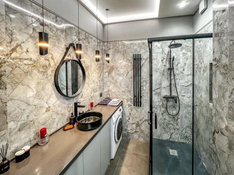 Из удобств: скоростной интернет (100мбит/сек), вентиляция, два кондиционера, теплые полы, полотенцесушитель, электрошторы в спальне, духовой шкаф, микроволновка, холодильник с морозилкой, посудомоечная машина, стиральная машина, телевизор, робот-пылесос.