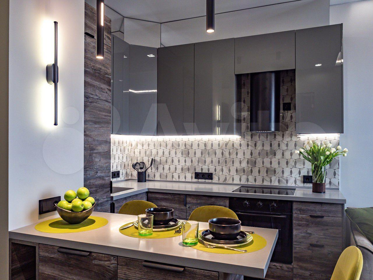 Просторная кухня-гостиная, где есть вся необходимая техника: духовая печь, индукционная плита, посудомоечная машина, измельчитель пищевых отходов, вытяжка, чайник, а также