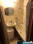 Санузел совмещённый, оснащён душевой кабиной, небольшой раковиной, унитазом и стиральной машиной.