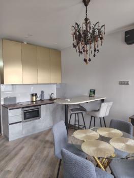 Кухня полностью оборудована всей необходимой техникой: холодильник, посудомоечная машина, духовой шкаф, варочная панель и вытяжка. В комнатах есть вся необходимая мебель. Ванная комната оснащена современной ванной и новой сантехникой.