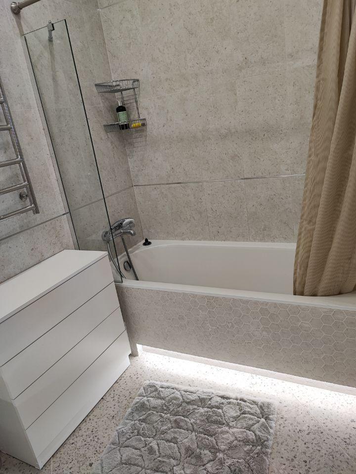 Квартира полностью готова к проживанию. Внутри вы найдете все необходимое: современная мебель на кухне и в комнате, а также полный набор техники — кондиционер, холодильник, посудомоечная и стиральная машины, телевизор. Ванная комната оборудована удобной ванной. Это жилье идеально подходит для комфортной жизни.