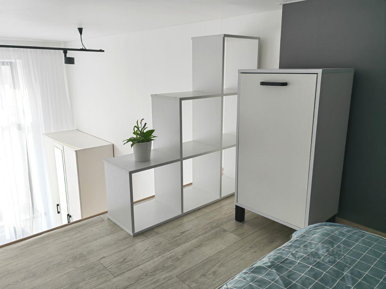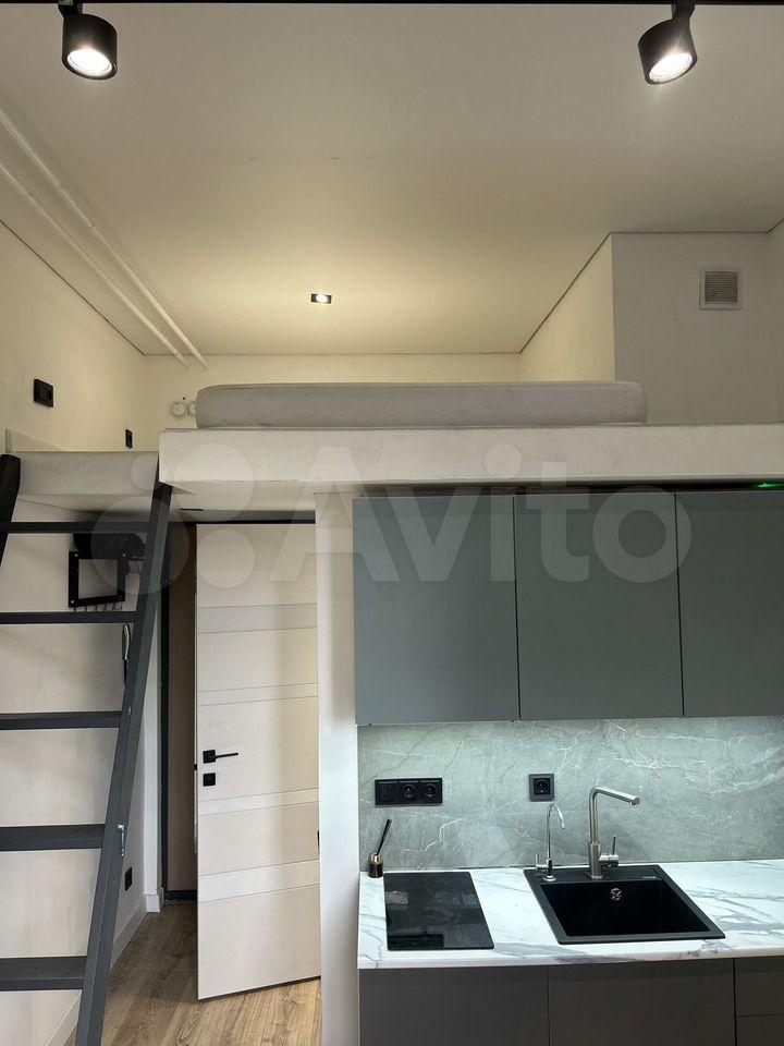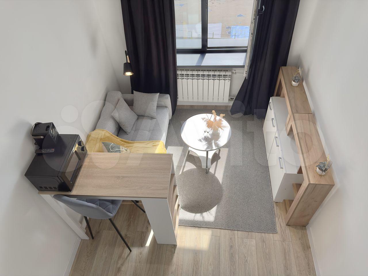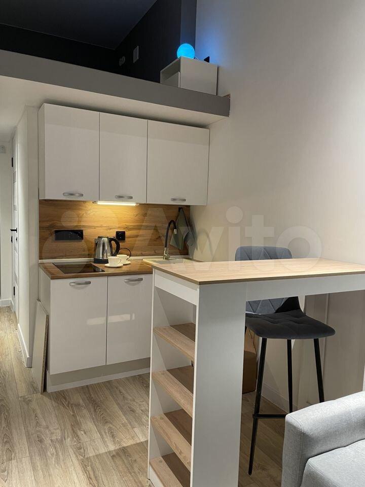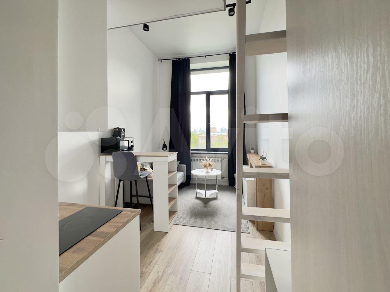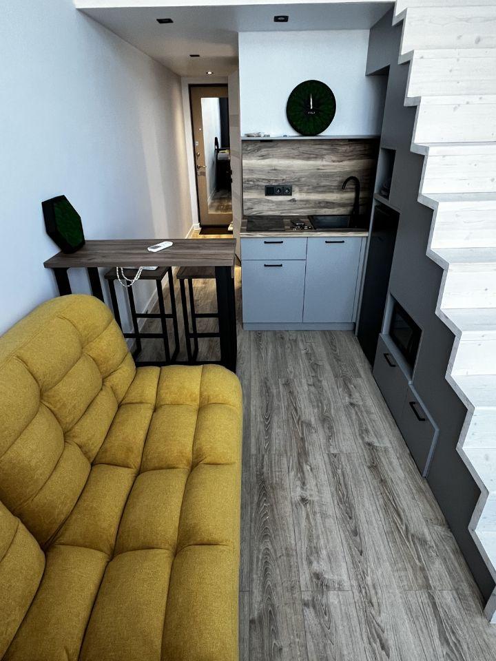 Апартаменты, 15м по низу+8м спальное место наверху. Большие окна, вся необходимая для проживания мебель и техника: стиральная машина, холодильник, микроволновая печь, плита, чайник, wi-fi, проектор для просмотра на стене, зеркало с подсветкой. Кровать с матрасом, одеялом и подушками, раскладной диван, барная стойка, места для хранения.