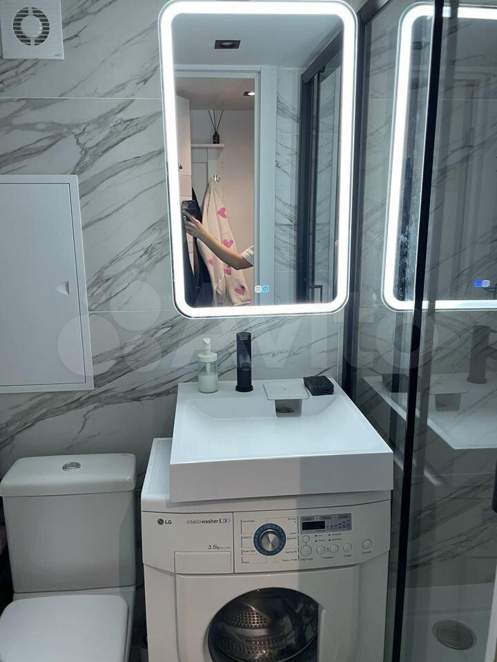 Санузел с душевой, стиральной машиной, зеркалом с подсветкой.