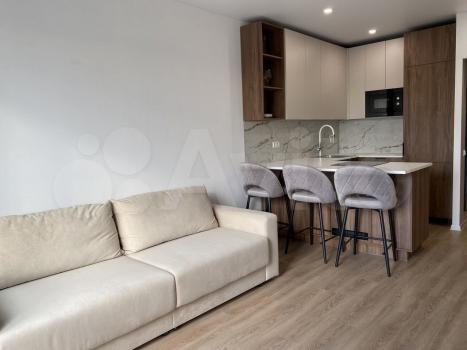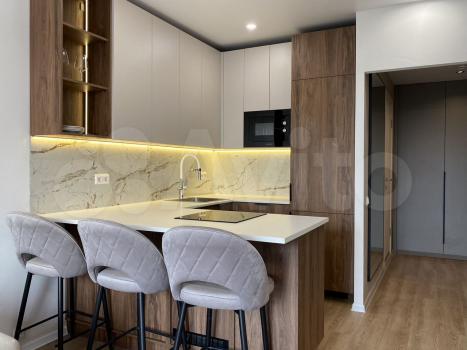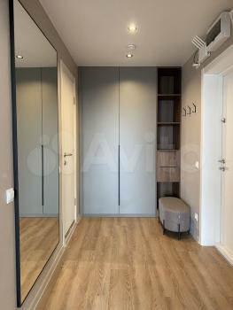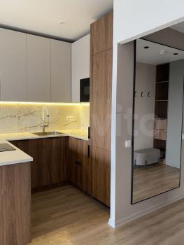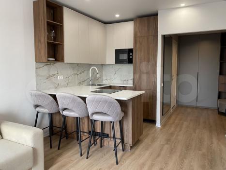 Квартира площадью 34,5 м² расположена на 7-м этаже, выполнена отделка в современном стиле, интерьеры полностью меблированы и укомплектованы техникой.