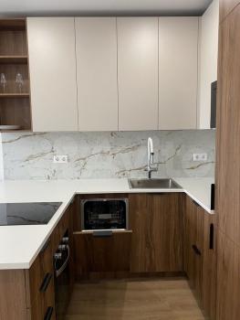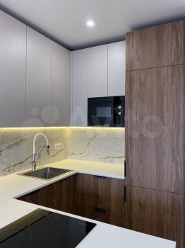 Диван раскладной, кровать 160*200 с подъемным механизмом и ортопедическим матрасом. Функциональная кухня, выполненная на заказ, с подсветкой и множеством мест хранения.