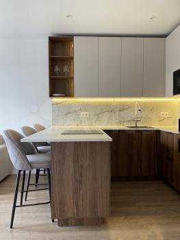 Стильная кухня со всей необходимой техникой ( электрическая плита, вытяжка, холодильник, микроволновка, чайник, встроенная стиральная машина),барная стойка, стулья, посуда.