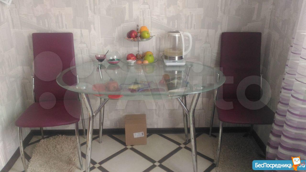 Кухня: кухонный гарнитур, стеклянный стол + 4 стула, плита, микроволновая печь, холодильник nofrost, телевизор.
