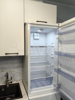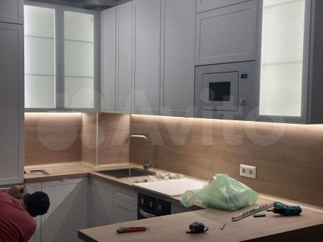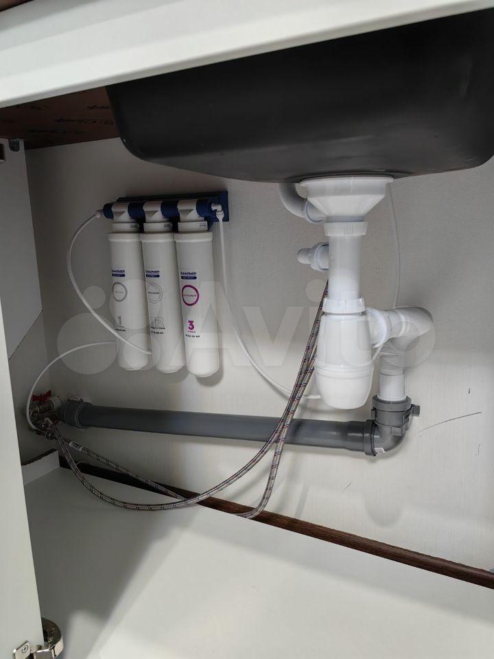 Кухня с подсветкой зоны приготовления, установлена 3-х уровневая система очистки воды "Барьер", есть небольшой набор посуды, столовых приборов.