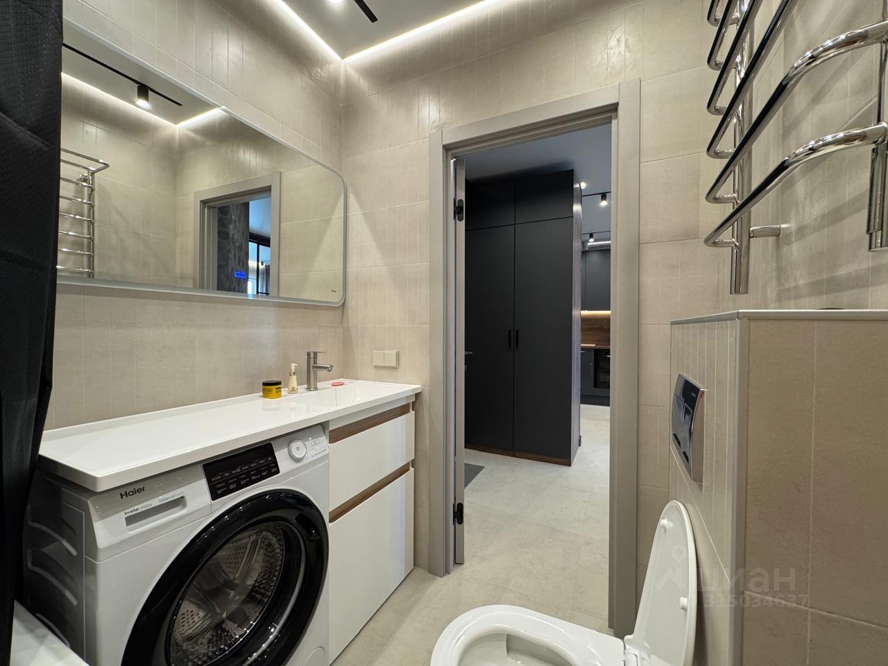 Ванная комната оснащена душевой кабиной, электрическим полотенцесушителем, современной стиральной машиной с функцией сушки, системой хранения вещей и прочими принадлежностями для комфортного и практичного проживания. Вся сантехника и аксессуары передовых итальянских и немецких производителей.